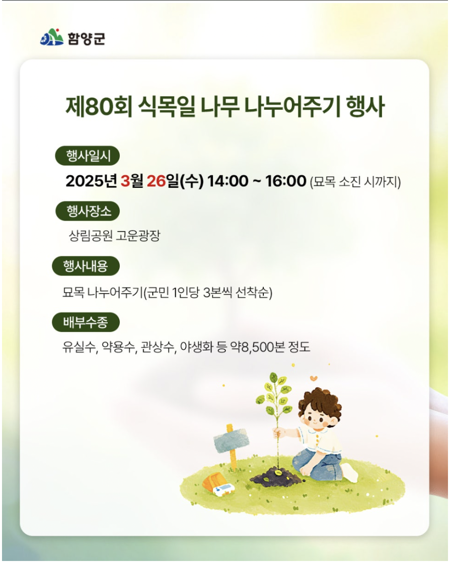 - 내용: 군민 1인당 3본의 묘목을 선착순으로 배부